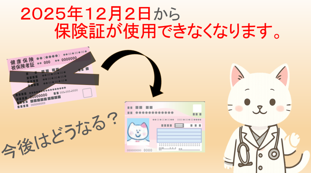 現在の健康保険証は2025年12月2日に完全廃止となり、今後医療機関受診時には基本的にマイナンバーカードを健康保険証として使用する『マイナ保険証』をご利用いただくことになります。